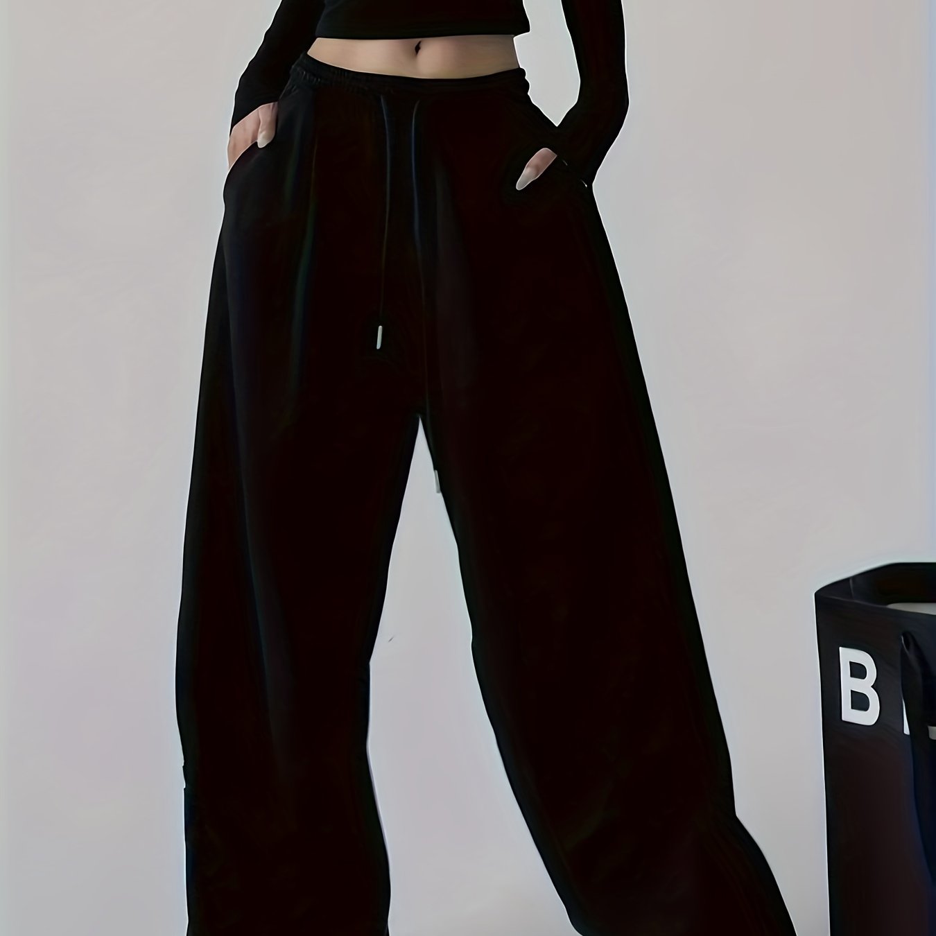 TEMU 솔리드 컬러 팬츠, 여성 하이웨스트 슬리밍 포켓 드로우스트링 플리츠 루즈 와이드레그 팬츠, 여성 스포츠 롱 팬츠