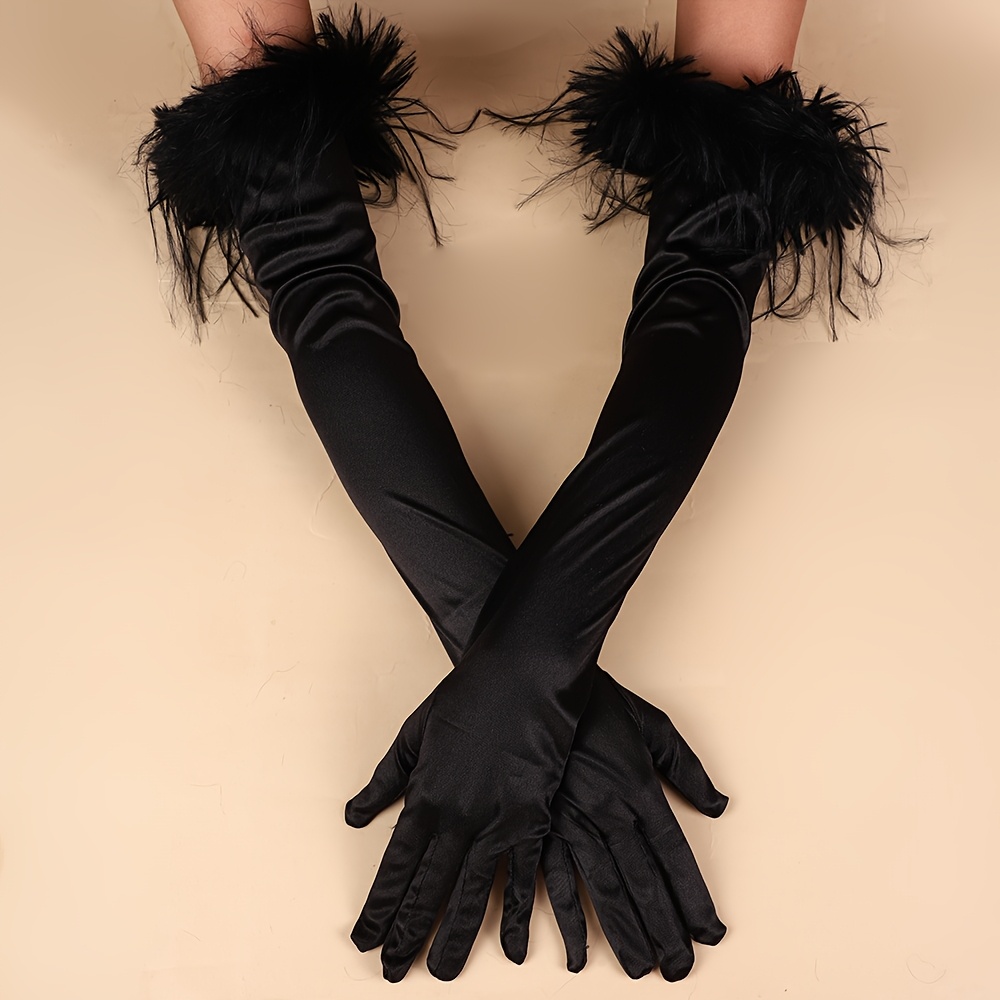 TEMU 여성용 롱 블랙 할로윈 코스튬 1920년대 새틴 장갑, 오페라 무대 새틴 커프 및 깃털 장식