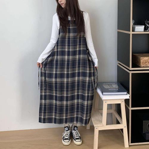 [옷자락]여성 러블리 배색 체크 롱 나시 원피스