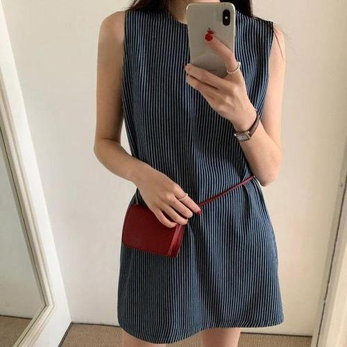 여성용 촘촘한 짜임잔스트라이프 슬리브리스 베이직 미니드레스