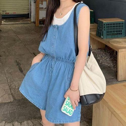 [옷자락]여성 여름 루즈핏 버튼 민소매 바캉스룩 유넥 점프수트