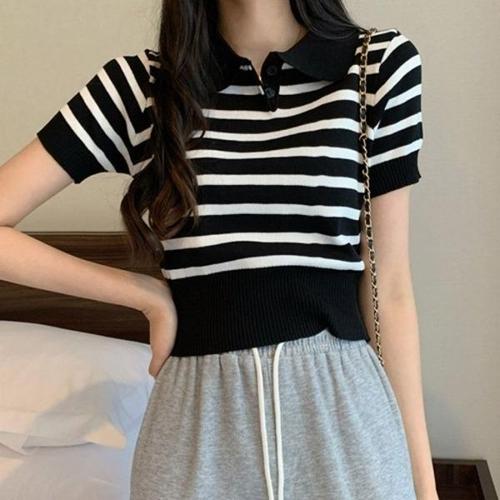 [엄지척]여름 스트라이프 패턴 크롭 기장 카라 반팔 니트_19803526_667501