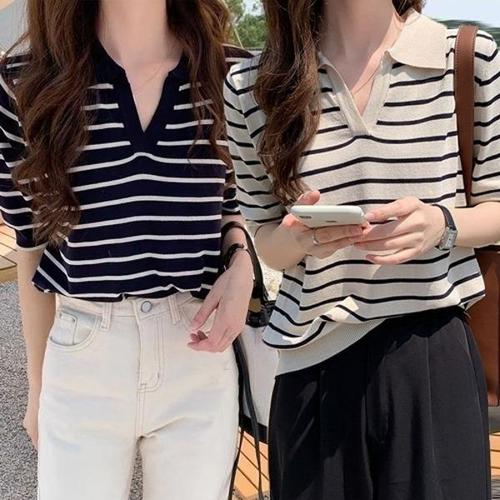 [엄지척]여성 여름 스트라이프 카라 넥 반팔 니트 티_19682098_667501