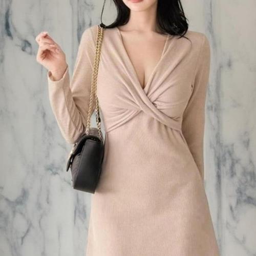 [다잇템][다잇템] 여자 V넥 잔주름 스웨터 롱 귀여운 바스트 원피스_23435857_588872