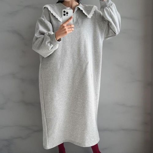 [옷자락] 여성 레이스 세일러넥 퍼프 소매 박시 기모 롱드레스