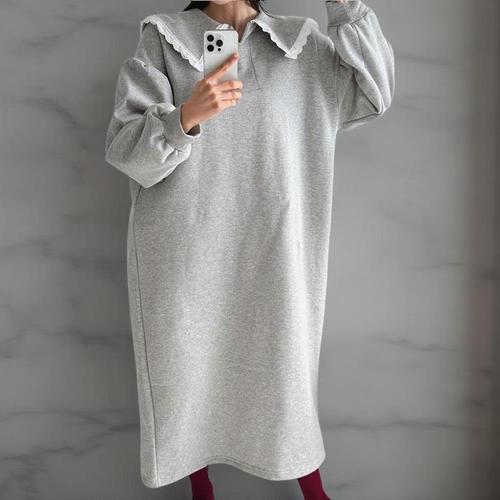 [옷자락]여성 레이스 세일러넥 퍼프 소매 박시 기모 롱드레스