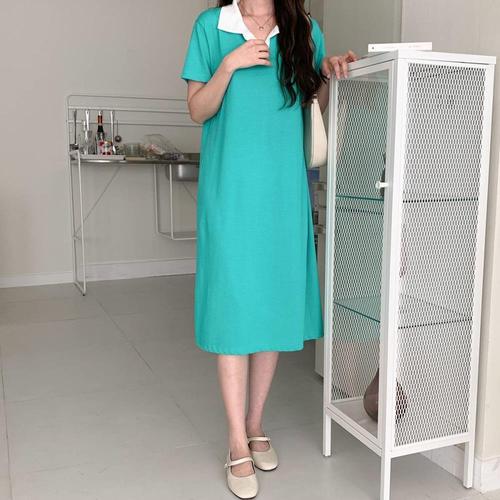 [다잇템]여성용 롱 슬릿 카라 미니멀리즘 반소매 원피스