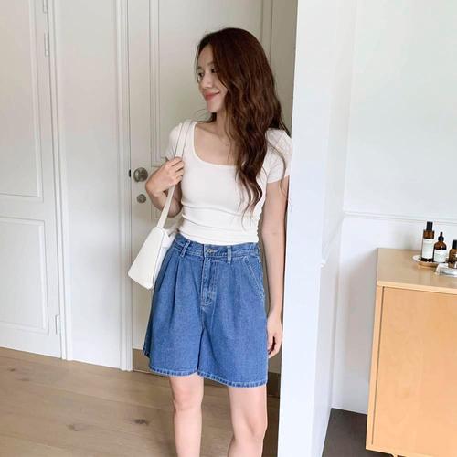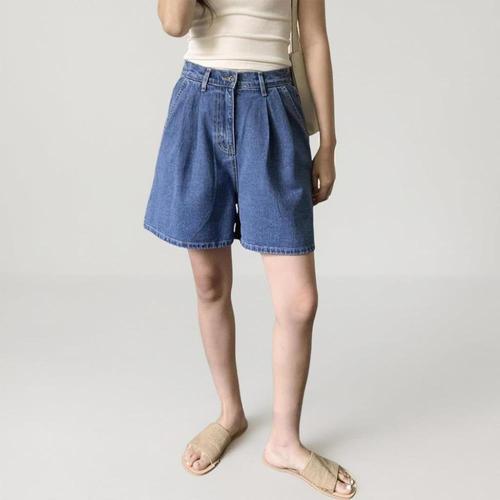 |KMP8D95|여성 심플 투핀턱 뒷밴딩 미디엄블루 청 반바지