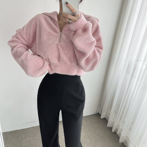 글램핏 / 하이 숏 카라 넥 세미 크롭 후리스 반집업 맨투맨 3컬