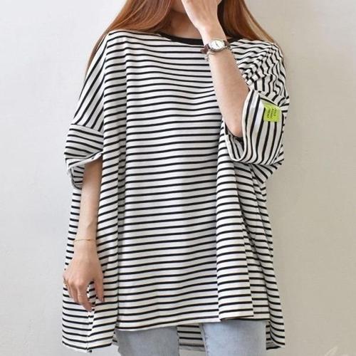 [엄지척]여자 스트라이프 단가라 오버핏 반팔 롱 티셔츠_19805942_667501