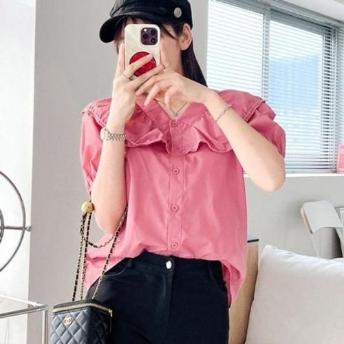 [엄지척]블라우스 V넥 핑크 프릴 여름블라우스 반팔블라우스_19660655_667501