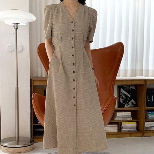 [에이치플러스몰]체크 브이넥 셔츠 반팔 퍼프 원피스