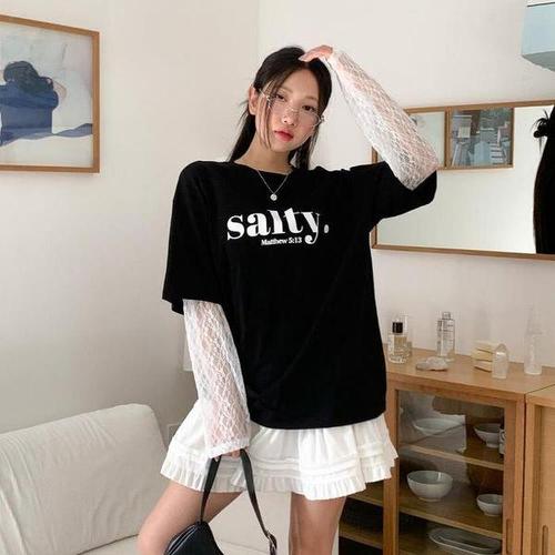 [다잇템_패션]여자 코디 소매 빅사이즈 레이스 캐쥬얼 반팔티