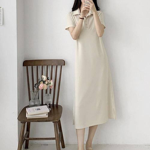 [옷자락]여자 단아한 버튼 카라넥 무지 반팔 양트임 롱원피스