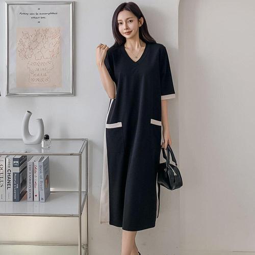 [옷자락]여자 배색 양트임 브이넥 반팔 빅사이즈 블랙 롱원피스
