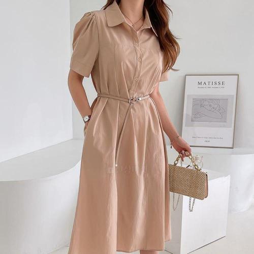 [옷자락] [시즌오프]여름 카라넥 반팔 가죽벨트 하객룩 롱 원피스_5
