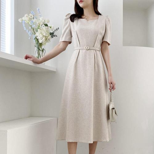[옷자락] [시즌오프]라운드넥 하객룩 반팔 벨트 롱 원피스_5