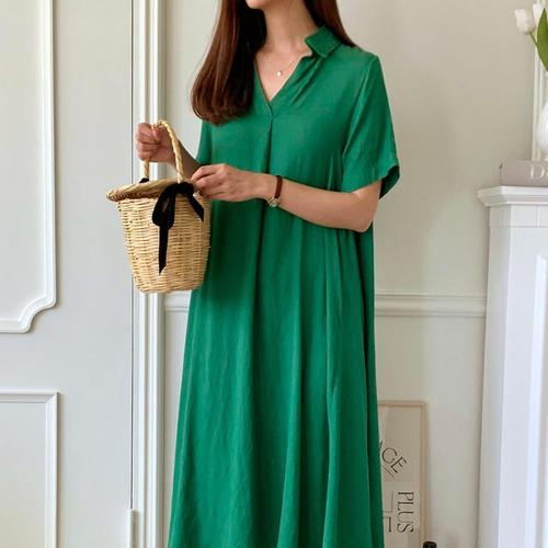 [옷자락] [시즌오프]브이넥 트임 일자핏 3컬러 롱 반팔 원피스_5