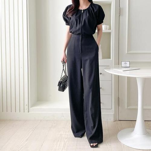 [바이어스]여자 라운드 지퍼 와이드 일자핏 반팔 점프슈트 코디 (10287415)