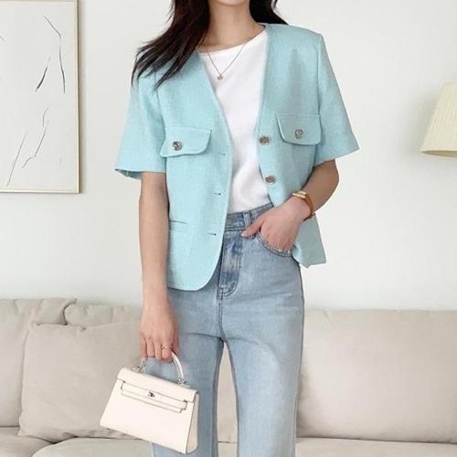 [다잇템][다잇템] 여자 카라없는 SS 반소매 V넥 플랩 주머니 트위드 자켓_12925798_588872