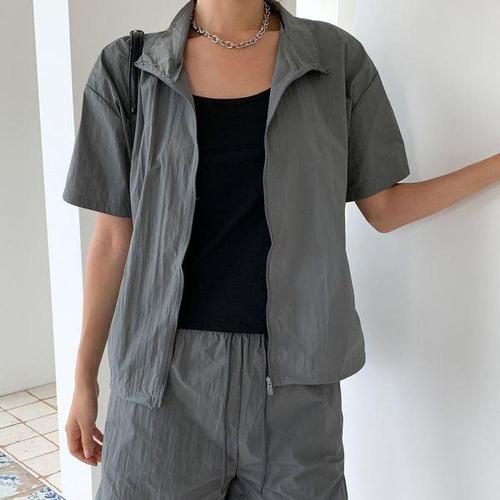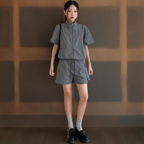 [신상오픈런]여성용 하이넥 반팔 집업 반바지 캐주얼 세트
