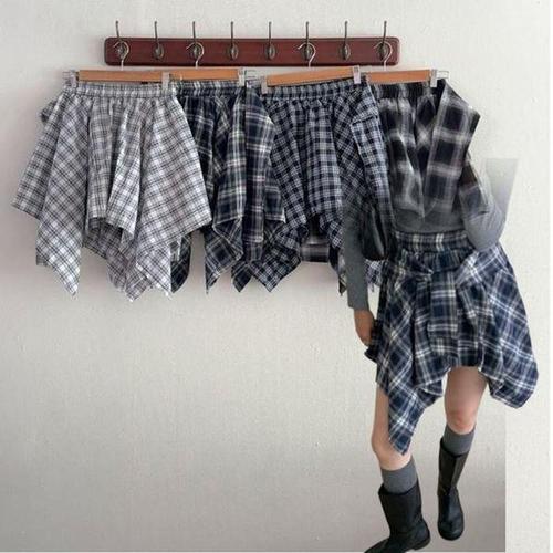 [신상오픈런]여성 체크 언발란스 미니 스커트 힙무드 스트랩 밴딩