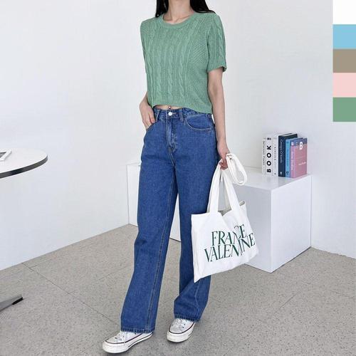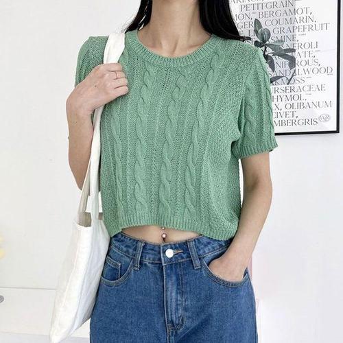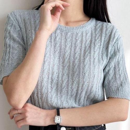 [에이치플러스몰]여리여리 세미크롭 케이블 짜임 라운드넥 반팔 니트