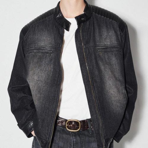 [버커루]남성 가죽 패치 바이커 BLACK 데님 자켓_US