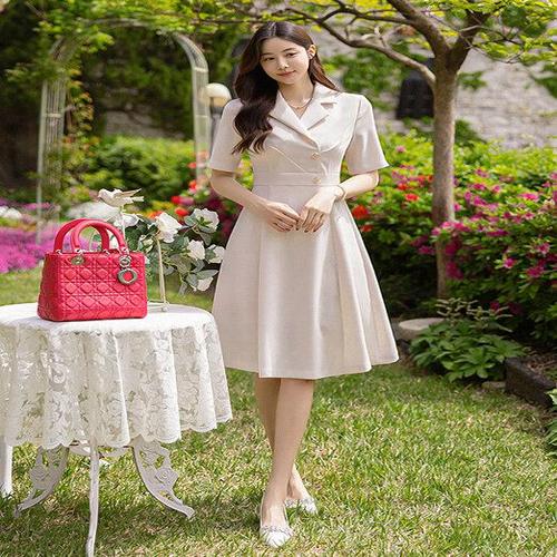 비비디아 여성 봄 가을 클래식 카라넥 금장버튼 플레어핏 하객룩 오피스룩 원피스 데일리룩(벨트포함)5573