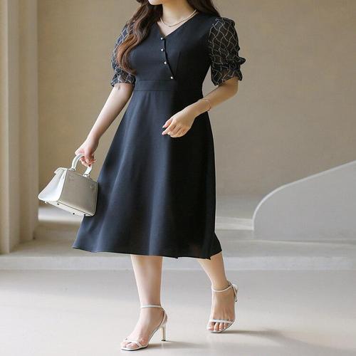 [스타일온미][루이스엔젤] 쉐인 체인 쉬폰 퍼프소매 랩 버튼 플레어 원피스