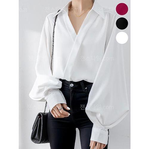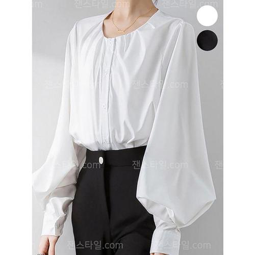 [셀러허브_여성트랜드패션]여성 벌룬 퍼프 화이트 블라우스 소매 셔츠 숄더 카라