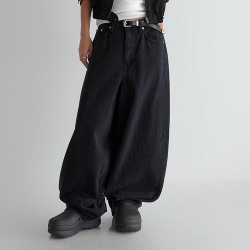 [옷자락] 여자 스트라이프 워싱 로우라이즈 벌룬 와이드 청바지