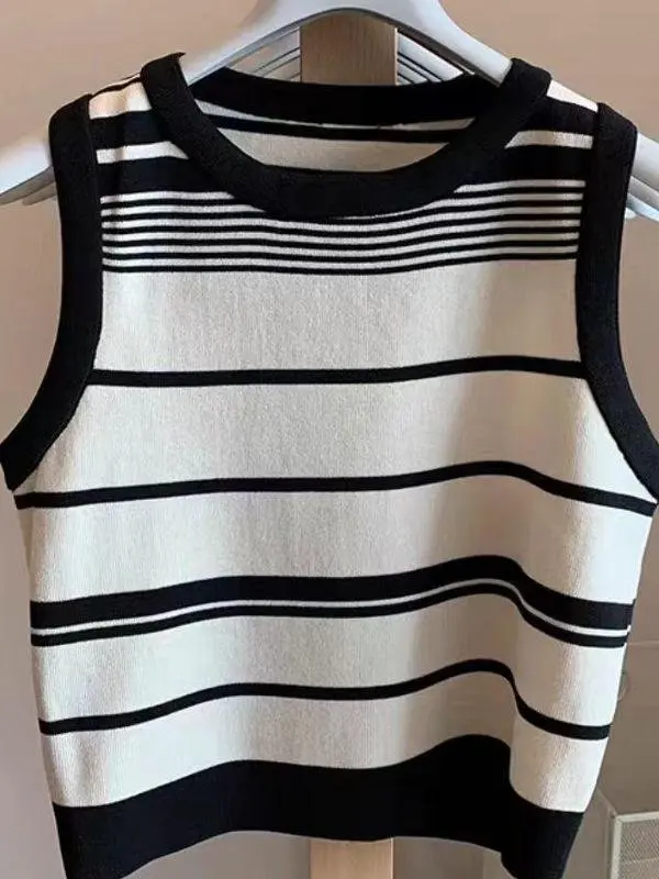 여름 스트라이프 컬러 블록 한국 스타일 조끼 짧은 니트 슬림 핏 라운드 넥 포켓 스퀘어 스카프 다용도 한국 슬리브 디자인