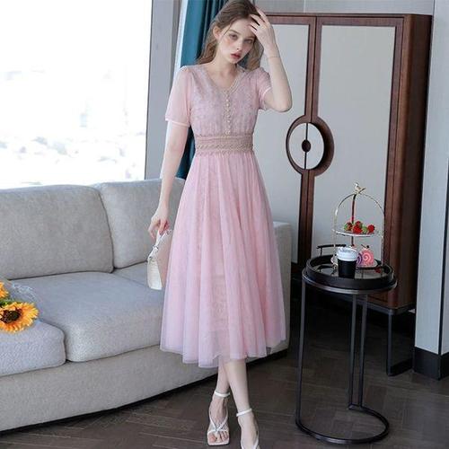 [지앤제이]슬림라인 베이비핑크 브이넥 쉬폰 원피스 경성의상 교