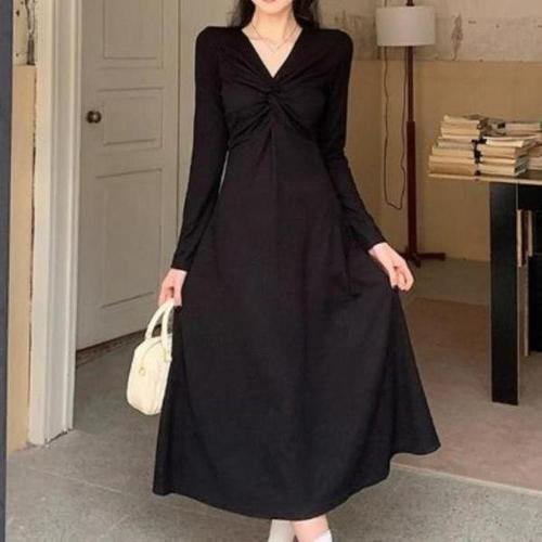 [다잇템_패션]여성용 검정 롱 V넥 베이직 트위스트 원피스