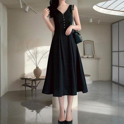 [다잇템_패션]여성 슬리브리스 검정 V넥 베이직 롱 원피스