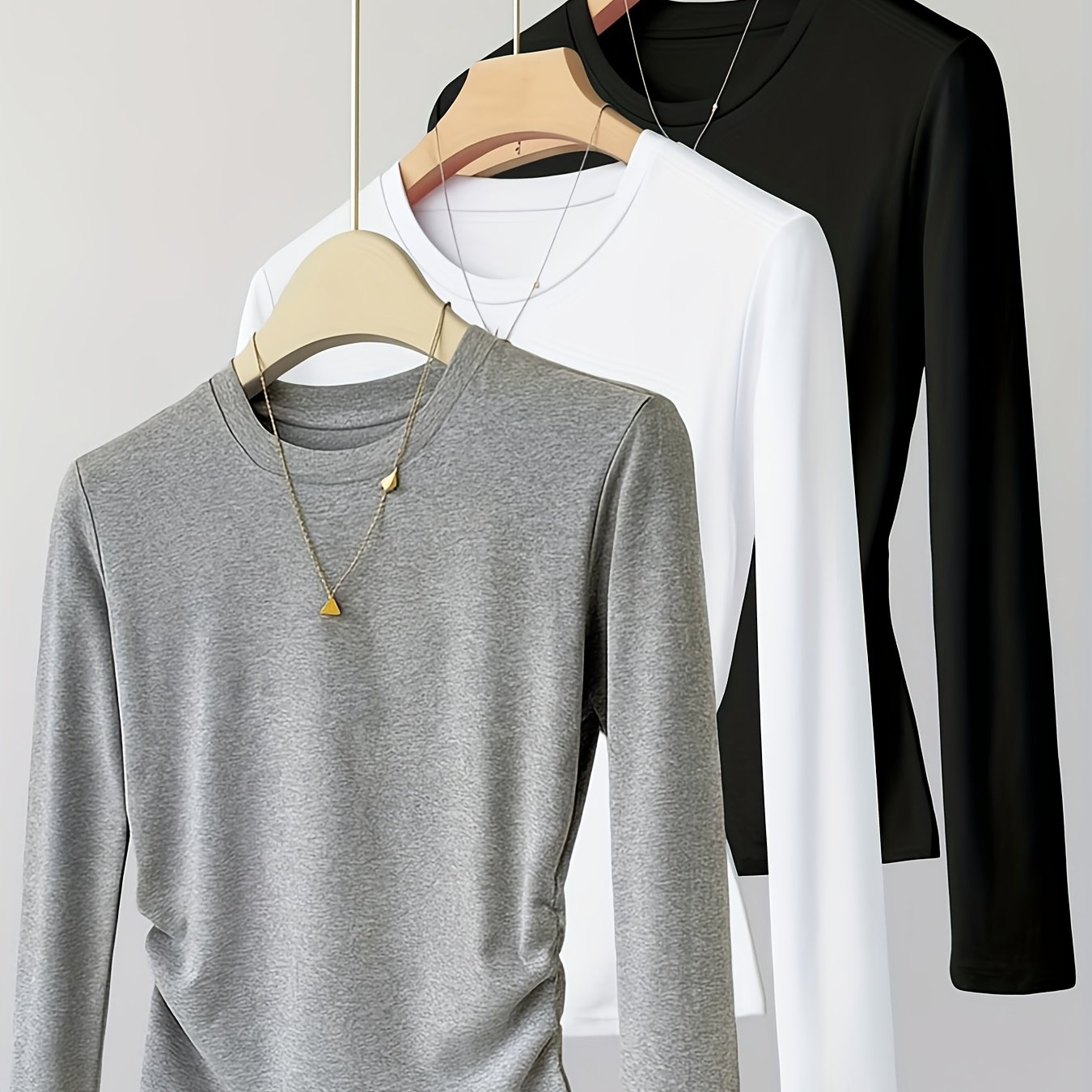 TEMU 여성용 우아한 러플 허리 티셔츠 3피스 - 벨트 스모크 드레스 디자인의 부드러운 미디엄 스트레치 솔리드 컬러 탑, 기계 세탁 가능한 가을/겨울 블라우스 (캐주얼 & 세미 포멀 착용) - 3피스 컬렉션|반팔티|반팔티셔츠|셔츠