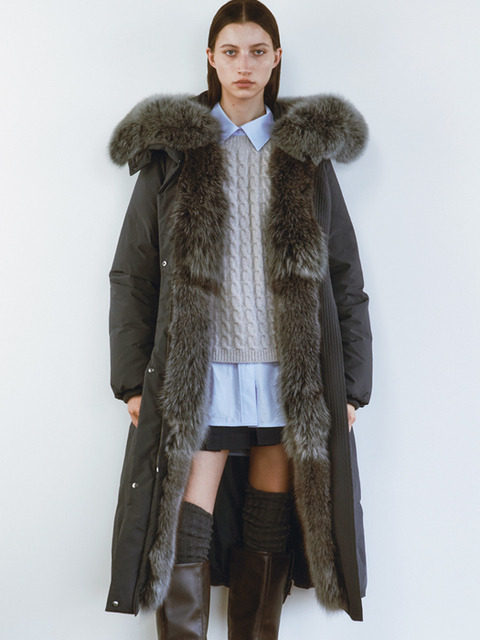 [하시에] 폭스퍼 트림 구스다운 롱 파카 [블루그레이] [차콜]