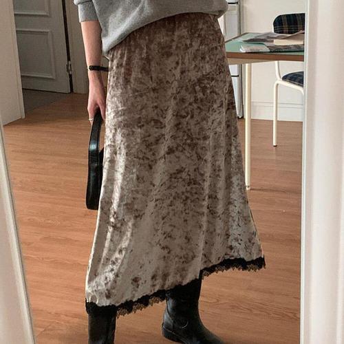 [신상오픈런]여자 벨벳치마 A라인 배색 레이스 밴딩 가을 롱스커트