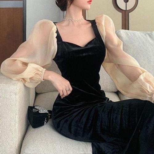 [셀러허브_여성트랜드패션]ONM 여성 파티 럭스 벨벳 시스루 퍼프 롱 원피스