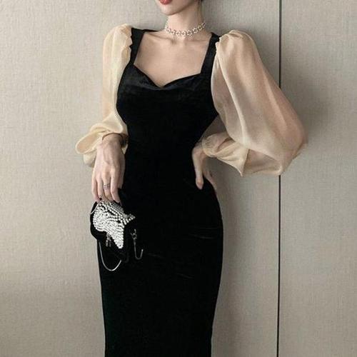 [옷자락] 여성 벨벳 레이어드 쉬폰 퍼프소매 슬림핏 롱 원피스