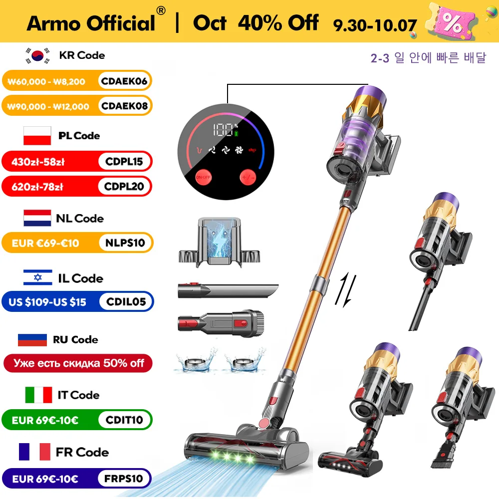 Armo V18 무선 휴대용 청소기 50kPa 출력 550W 디지털 모터 강력 6-in-1 무선 청소기 LED 터치스크린 디스플레이 휴대용 청소기