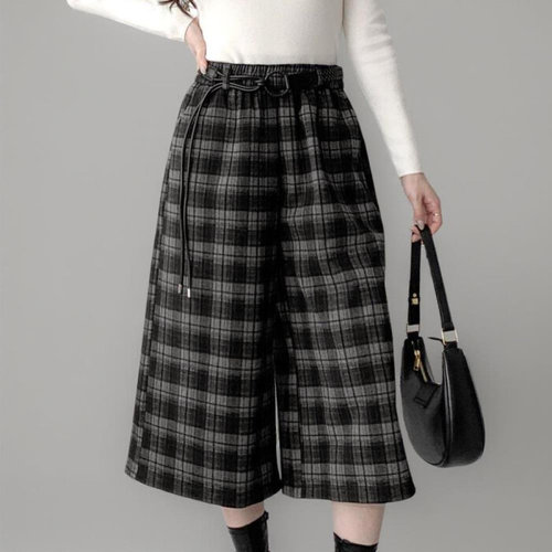 옷자락 / 여성 8부 체크 바지 와이드핏 링벨트 밴딩 겨울 팬츠