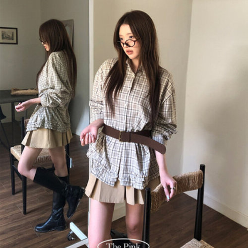 더핑크 / 채아 빈티지 체크 프릴 셔츠 + 스웨이드 벨트 set