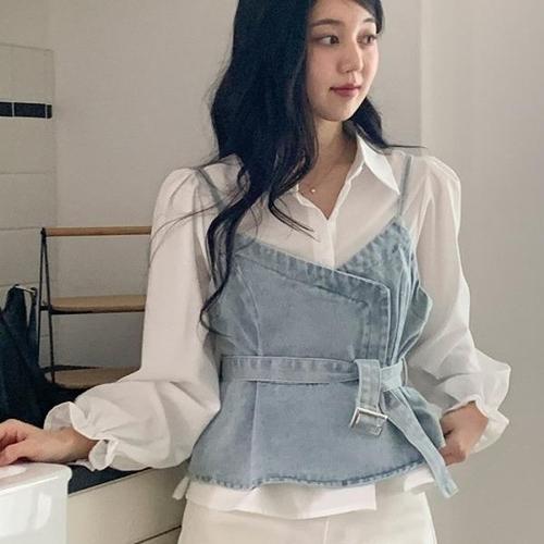 [신상오픈런]|CMD245D|코르셋 데님뷔스티에 랩조끼 벨티드 셔링 흰블라우스_20459009_597559
