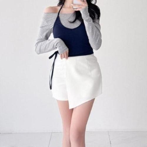 [신상오픈런]여성 홀터넥 배색 오프숄더 긴팔 티셔츠