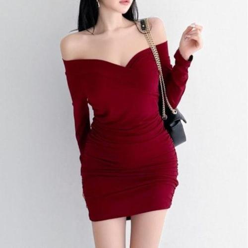 [신상오픈런]여성 슬림핏 오프숄더 셔링 미니 드레스 긴팔 파티룩