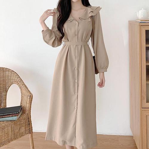 [쿠잉]3컬러 웨이브카라 봄가을 여성 롱 원피스
