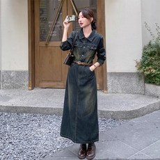 COSYEVNO 여성 롱 데님 원피스 봄 가을 캐주얼 슬림 패션 셔츠 칼라 스커트