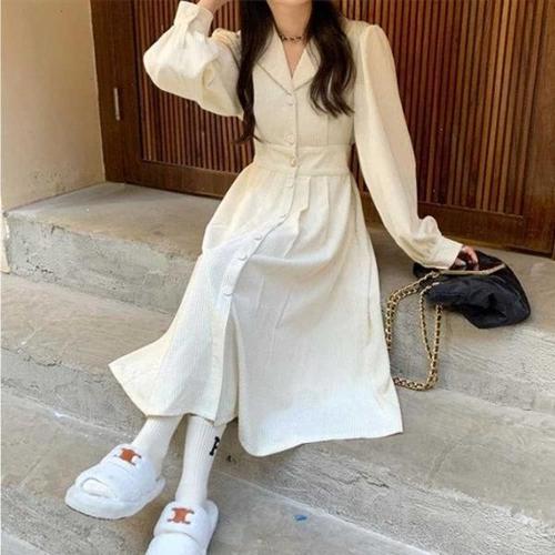 봄 가을 모던 원피스 여 고급 허리 조임 루즈핏 날씬해 보이는 기질 린넨 스커트 개량 일상복 나들이룩 긴발 원피스